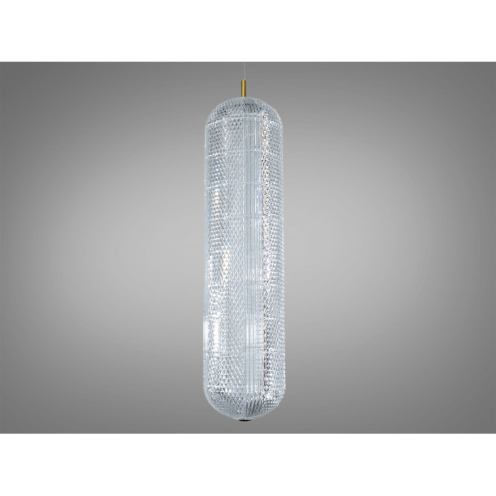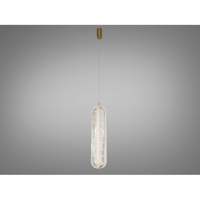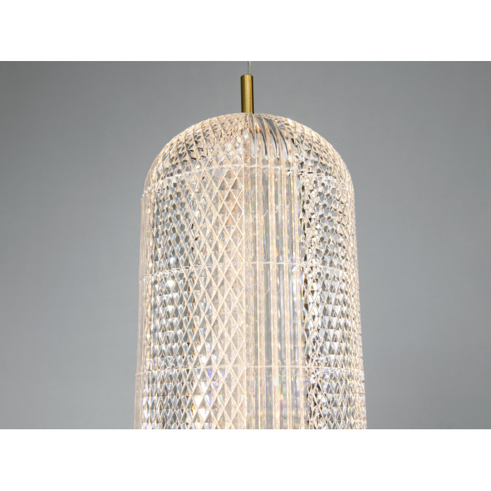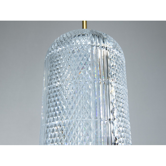 Підвіс має округлу форму з золотистою окантовкою та прозорим заповненням, яке створює ефект кришталю. Такий підхід візуально полегшує світильник і допомагає світлу м’яко розсіюватися. Діаметр плафона близько 15 см — розмір, що не перевантажує простір і виглядає акуратно над окремою зоною. Корпус підвішений на тонкому тросі, тому композиції з 2–3 однакових світильників над стільницею чи столом виглядають зібрано та ритмічно.