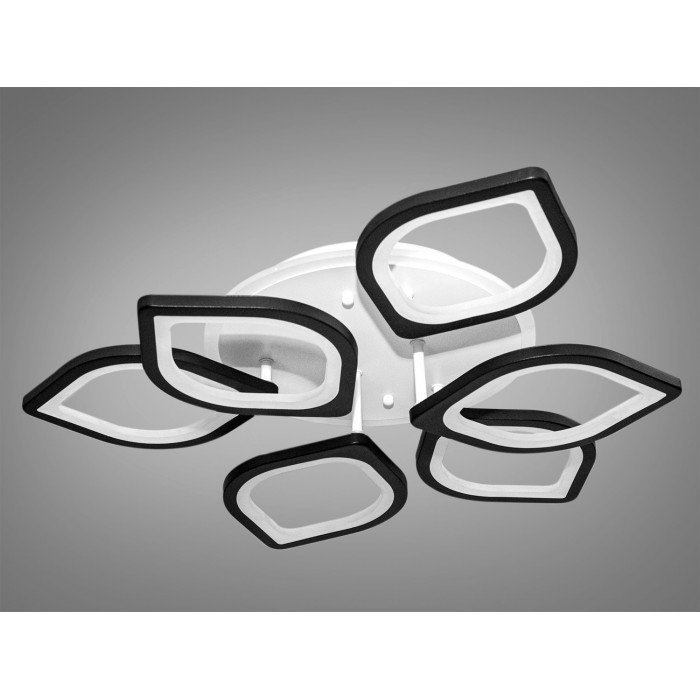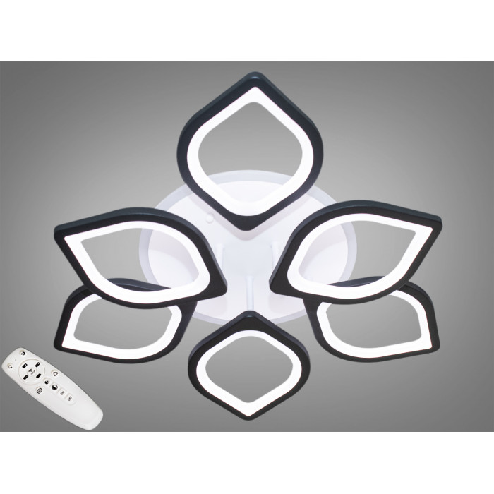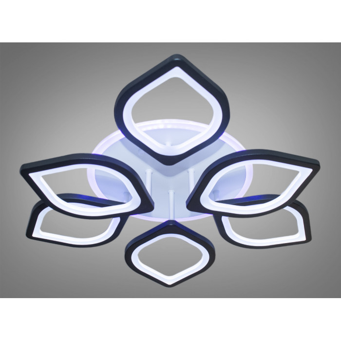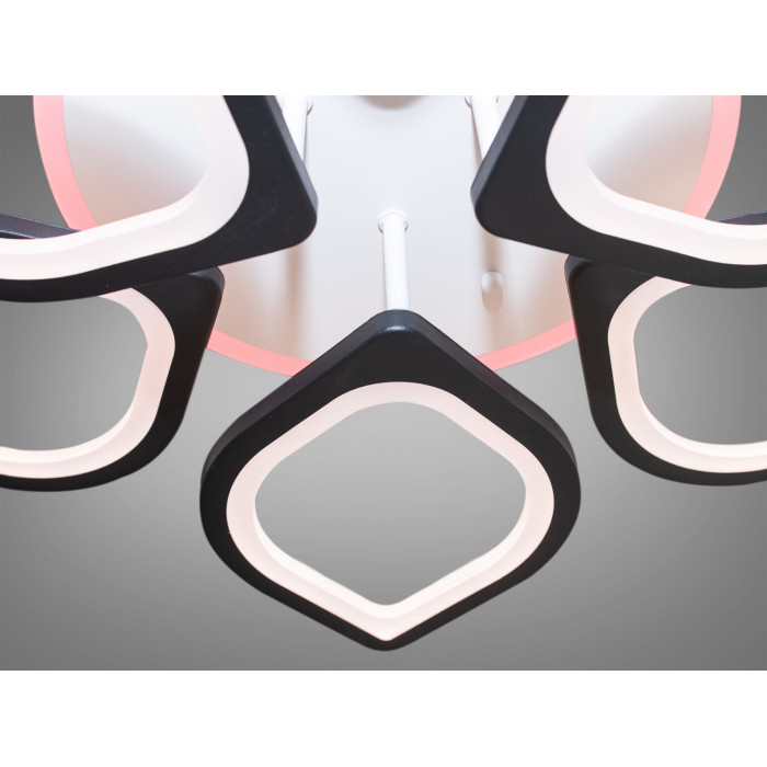 Ці елементи, зроблені із металу та акрилу, розташовані на кількох рівнях, створюючи об'ємний і динамічний вигляд. Освітлення пристельової круглої основи має теплий червоний відтінок, що робить загальний вигляд м'яким та привітним. Люстра на пульті, що дозволяє регулювати рівень освітлення та колірну температуру. Діодна люстра має декілька режимів: холодний 6000К, нейтральний 4100К, теплий 3200К, синє LED підсвічування, червоне LED підсвічування, рожеве LED підсвічування, поєднаний режим - будь основне світло плюс будь-який колір світлодіодного підсвічування - все залежить від вашого настрою.