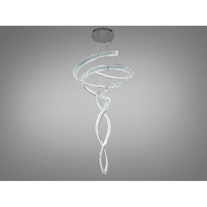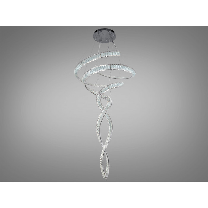 Світлодіодна кришталева люстра зі спіральними кільцями у золотому відтінку створює яскравий акцент у сучасному інтерʼєрі. Конфігурація з двох овальних кілець та прозорих кришталевих елементів формує виразний каскад, який доречно виглядає в приміщеннях з високими стелями. Потужність 285 Вт передбачає ефективне освітлення до приблизно 50 м², а дистанційне керування додає зручності у щоденному використанні. Загальна висота підвісу становить близько 180 см, що дозволяє підкреслити вертикальний обʼєм приміщення.