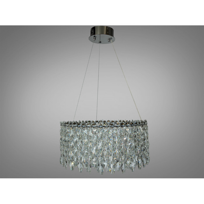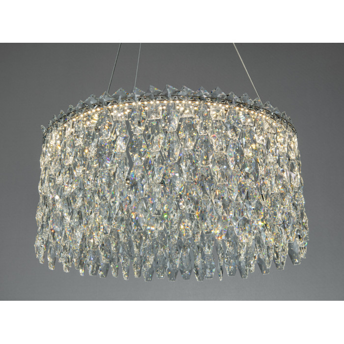 Модель у хромі з трьома кільцями створює виразний світловий акцент завдяки прозорим кристалам, що грають відблисками. Конструкція передбачає вбудовані світлодіоди загальною потужністю 66 Вт, що зазвичай достатньо для до 11 м² при стандартній висоті стелі. Формат підвісу допомагає візуально «підтягнути» простір, а холодний блиск хрому підкреслює сучасний характер інтер’єру.