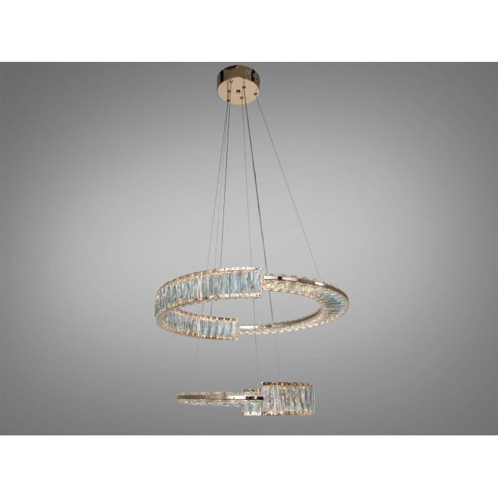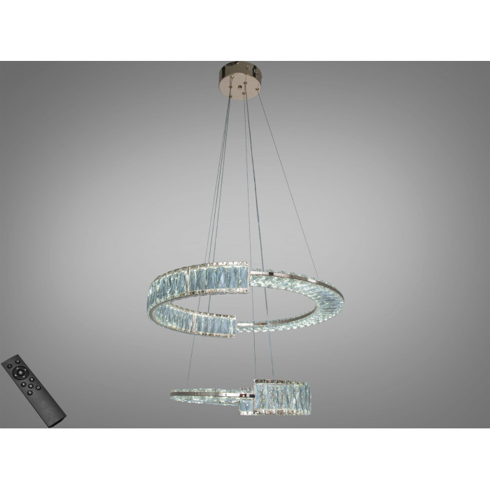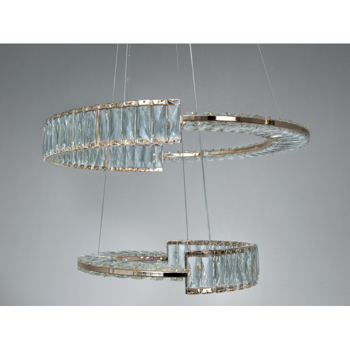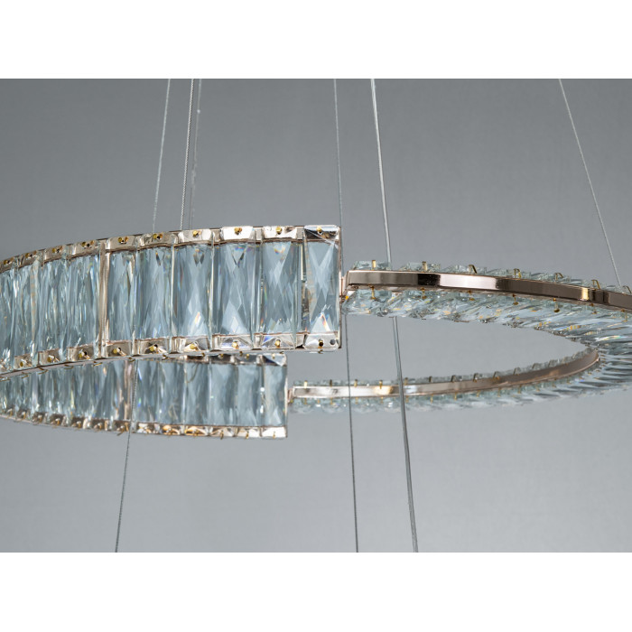 Висновок: якщо потрібне кероване та виразне освітлення з сучасною естетикою, підвісна LED-люстра з двома кришталевими кільцями у золоті 103 Вт може стати доречним рішенням для житлових і частини комерційних просторів. Дизайн двох кілець додає глибини й дозволяє вибудувати світло під конкретні сценарії, а пульт робить цю зміну швидкою та зручною.