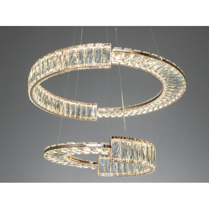 Світлодіодна підвісна люстра з двома кришталевими кільцями у теплому золотому відтінку створює виразний світловий акцент і підкреслює геометрію простору. Модель передбачає димування з пульта для плавного регулювання яскравості та зазвичай підходить для кімнат орієнтовно до 18 м² (результат залежить від висоти стелі й кольору оздоблення). Два кільця діаметром близько 60 і 40 см формують багатошарове освітлення: верхнє кільце працює як загальний світловий контур, нижнє — додає глибини та декоративних відблисків.