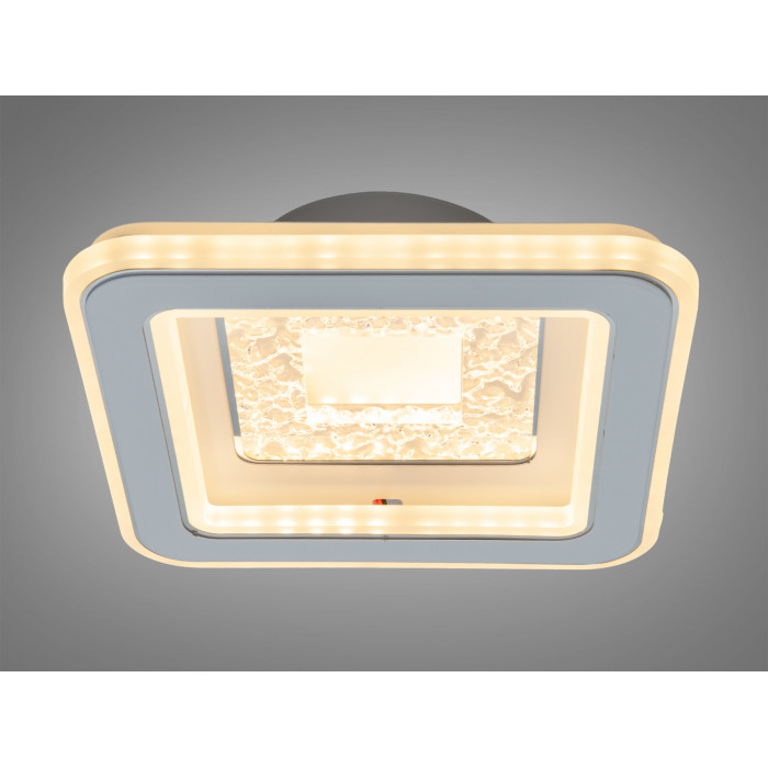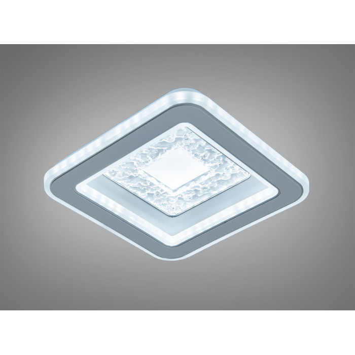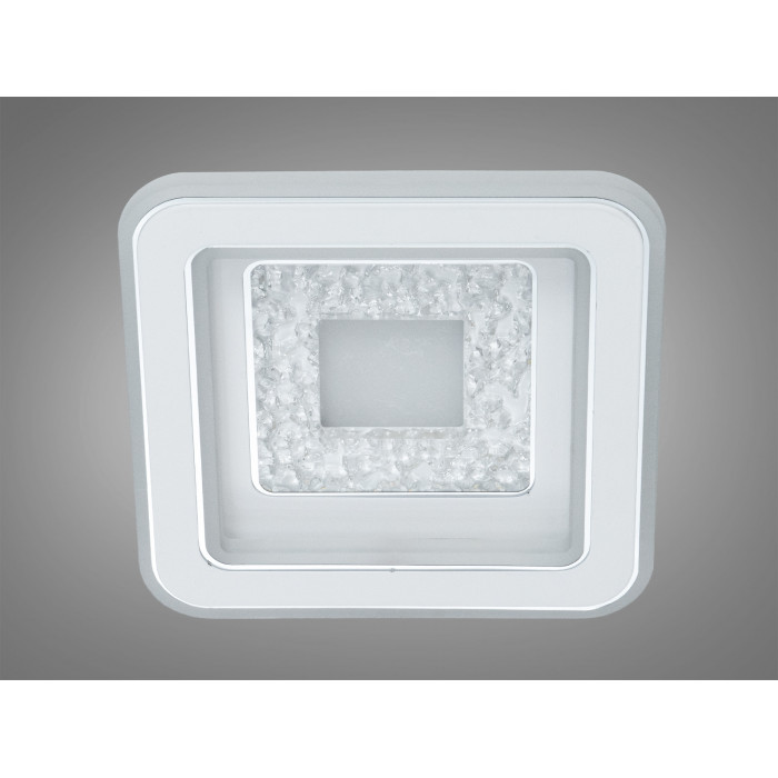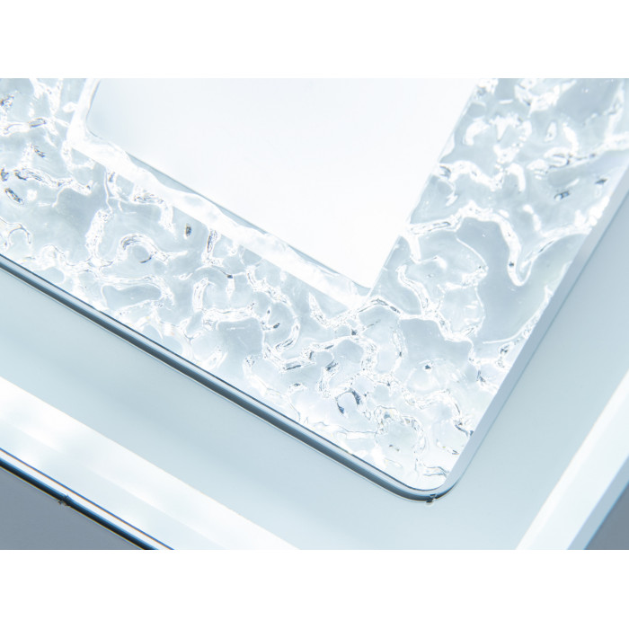 Квадратна форма допомагає розподіляти світло по периметру, а геометрія легко поєднується з прямими лініями сучасних інтер’єрів. У дизайні передбачені прозорі вставки, що створюють візуальний ефект кришталю, матові краї для м’якшого переходу світлового потоку та текстурована центральна частина, яка додає об’єму без перевантаження деталей. Невелика висота корпусу візуально не обтяжує простір, тому модель розглядають для стель стандартної та зниженої висоти.