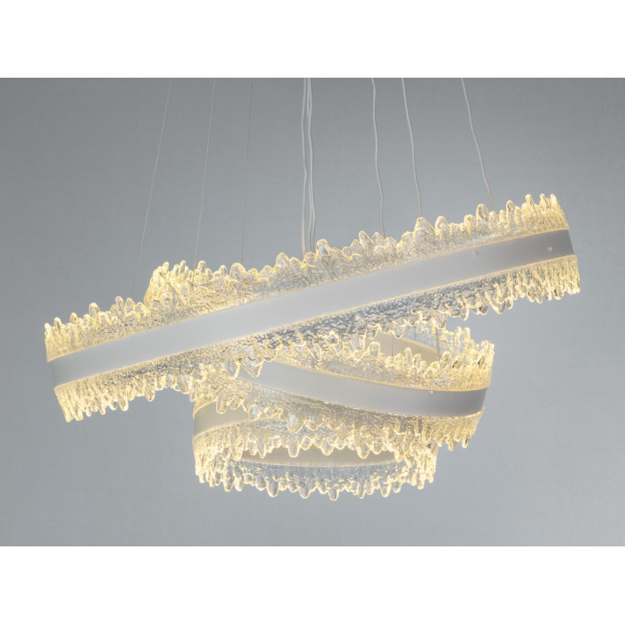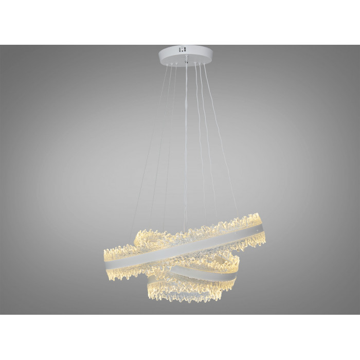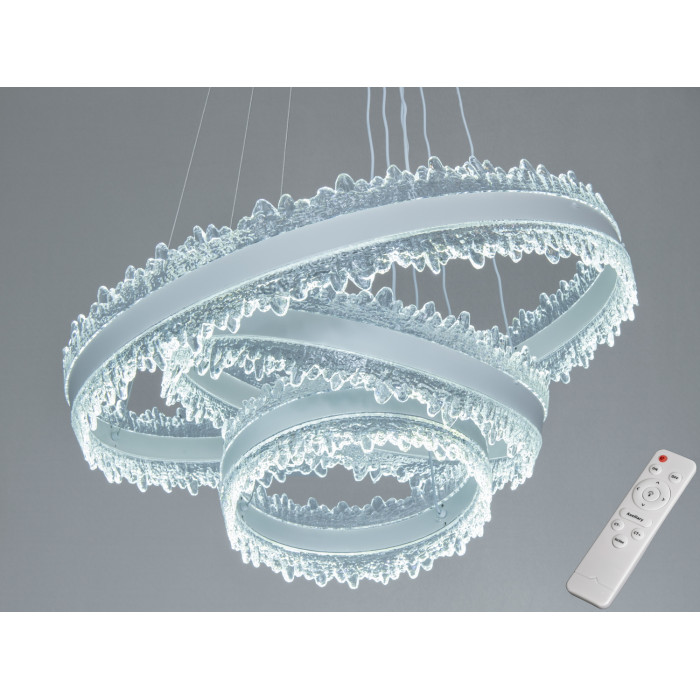 Люстра поєднує підвісну конструкцію на надійних тросах і металевий корпус у білому кольорі. Декоративні кристалічні вставки на кільцях працюють як світлорозсіювачі, роблячи проміння більш м’яким та рівномірним. Пульт ДК дозволяє зручне налаштування яскравості — від робочого рівня до приглушеного вечірнього світла. Конструкція передбачає стельове кріплення, що підходить для квартир, приватних будинків і громадських просторів. За необхідності можна розглянути версію у чорному кольорі як альтернативу до білого оздоблення інтер’єру.