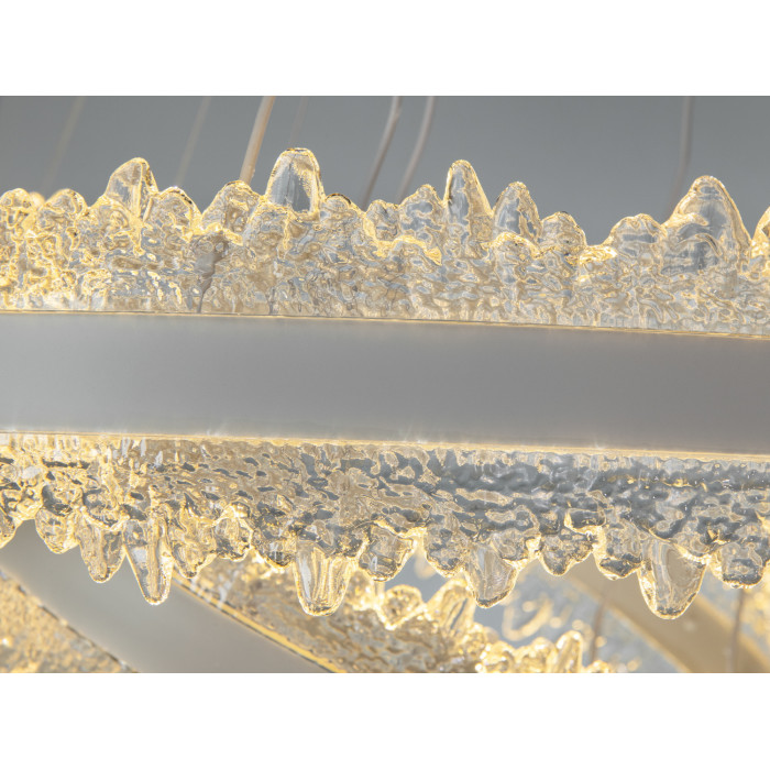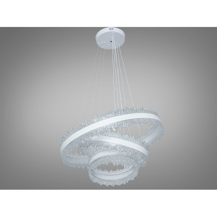 - Тип: світлодіодна підвісна люстра на тросах, 3 кільця з кристалічним декором.