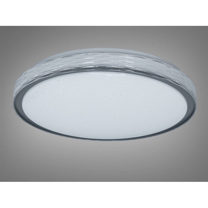 Кругла стельова люстра з м′яким розсіяним світлом створює комфортне базове освітлення у невеликих приміщеннях. Корпус виконано у стриманому сірому відтінку з білим матовим плафоном та прозорим декоративним обідком, що візуально нагадує текстуроване скло. Конструкція передбачає щільний стельовий монтаж, що економить висоту кімнати та забезпечує рівномірний розподіл світла.