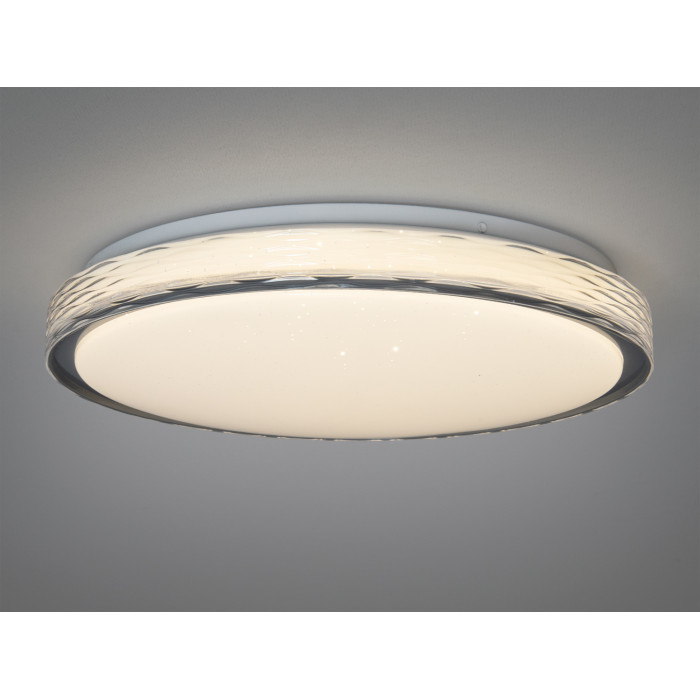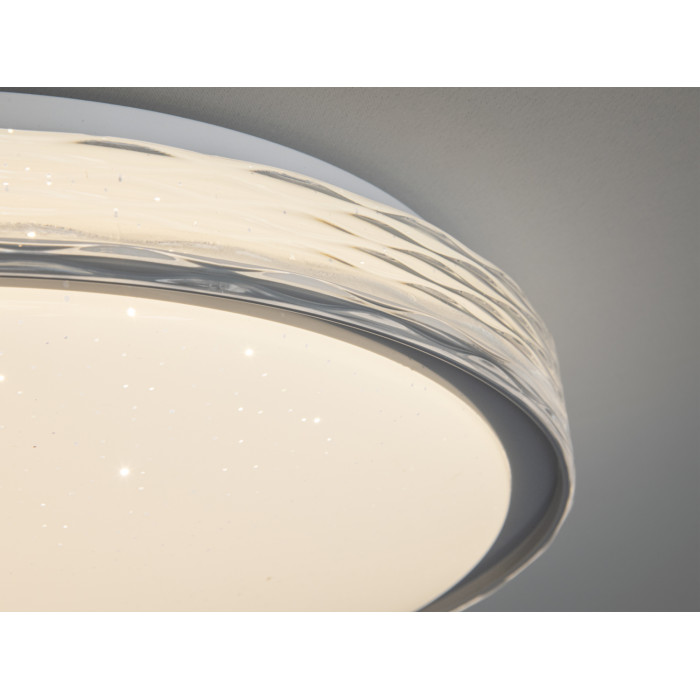 Корпус і розсіювач виготовлені з міцного пластику, що добре переносить щоденну експлуатацію та спрощує догляд. Декоративний прозорий кант додає ефекту «легкості» без ускладнення монтажу. Конструкція розрахована на стельове кріплення з прихованою фурнітурою, що виглядає акуратно у будь-якій кімнаті.