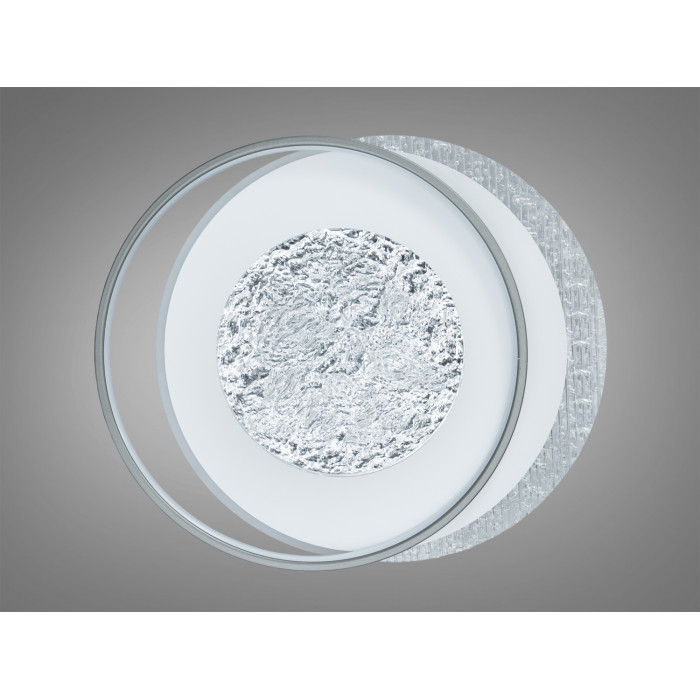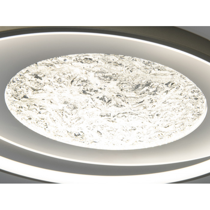 Модель вирізняється круглим дизайном із чорною центральною вставкою та текстурованим елементом у центрі. Два світлові кільця формують м’яке, розсіяне сяйво, а прозорий текстурований розсіювач допомагає уникати різких тіней. Низький профіль монтажу на стелю виглядає акуратно та підходить до приміщень із невисокими стелями.