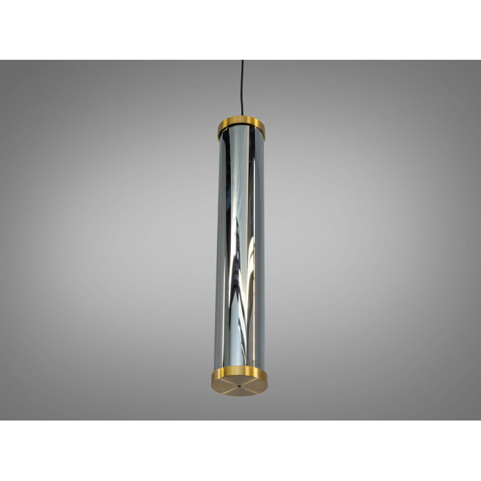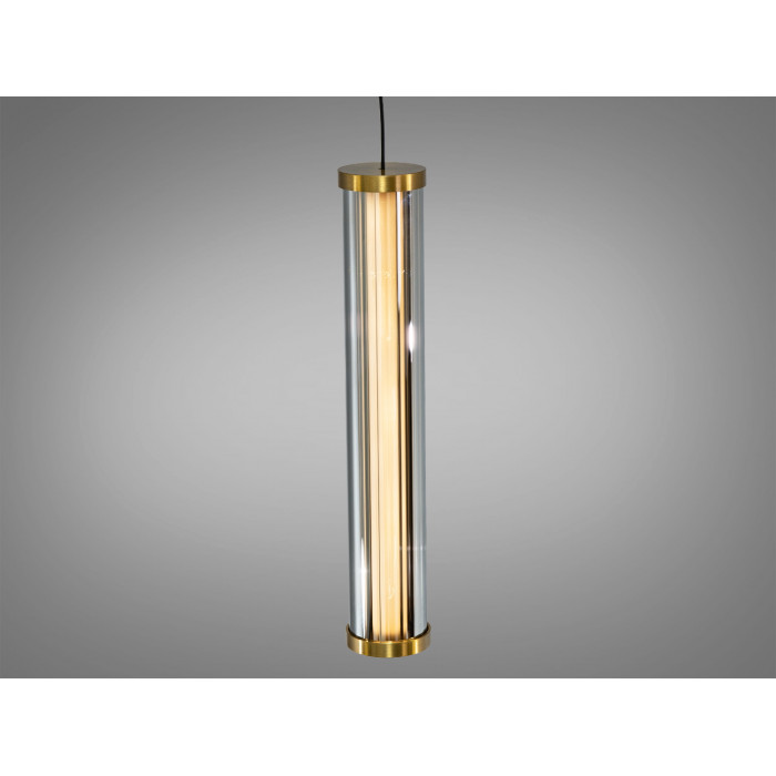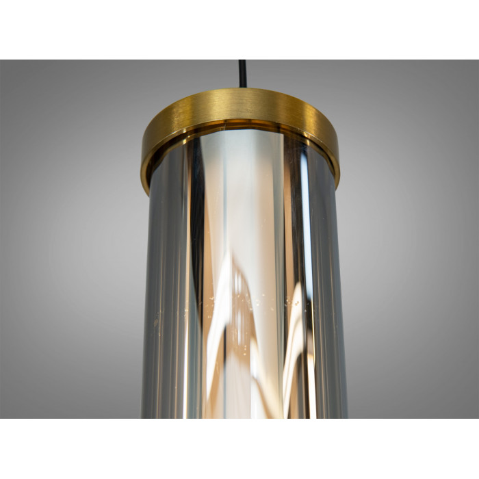 Світильник має витягнуту циліндричну форму з металевим каркасом у золотому покритті. Усередині розміщені фасетовані кришталеві елементи, що заломлюють і м’яко розсіюють світловий потік. Завдяки поєднанню металу та кришталю підвіс виглядає виразно над барною стійкою, тумбою або журнальним столиком. Візуальний ефект підсилюється, якщо встановити кілька однакових підвісів лінією або групою.