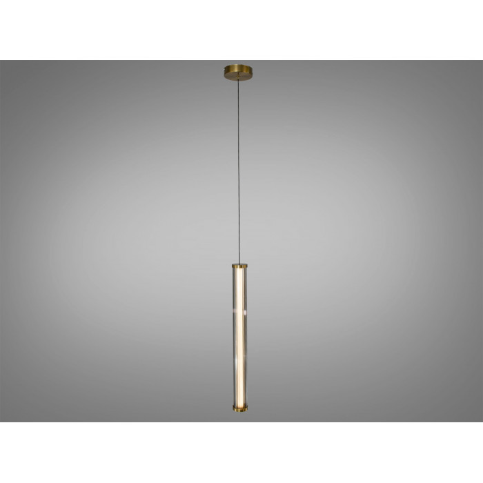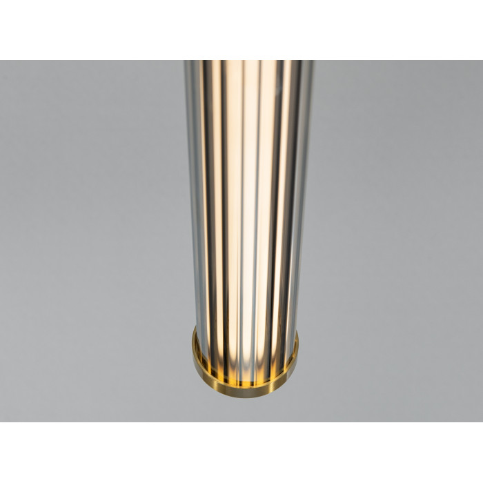 Світильник має витягнуту циліндричну форму з металевим каркасом у золотому покритті. Усередині розміщені фасетовані кришталеві елементи, що заломлюють і м’яко розсіюють світловий потік. Завдяки поєднанню металу та кришталю підвіс виглядає виразно над барною стійкою, тумбою або журнальним столиком. Візуальний ефект підсилюється, якщо встановити кілька однакових підвісів лінією або групою.