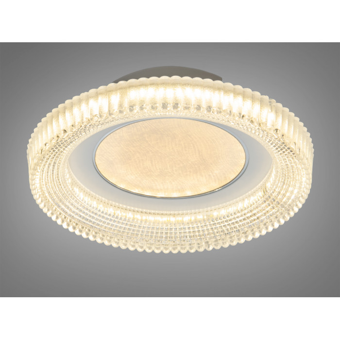 Світильник має круглий корпус білого кольору та скляний плафон, який передбачає прозору чи легку текстуру для м’якого розсіювання. У центрі розміщується декоративний квітковий акцент, що додає виразності й доречний у сучасних інтер’єрах. Конструкція накладного монтажу з низьким профілем виглядає акуратно на стелі, а LED-модулі приховані, завдяки чому світло подається рівномірно без яскравих точок.