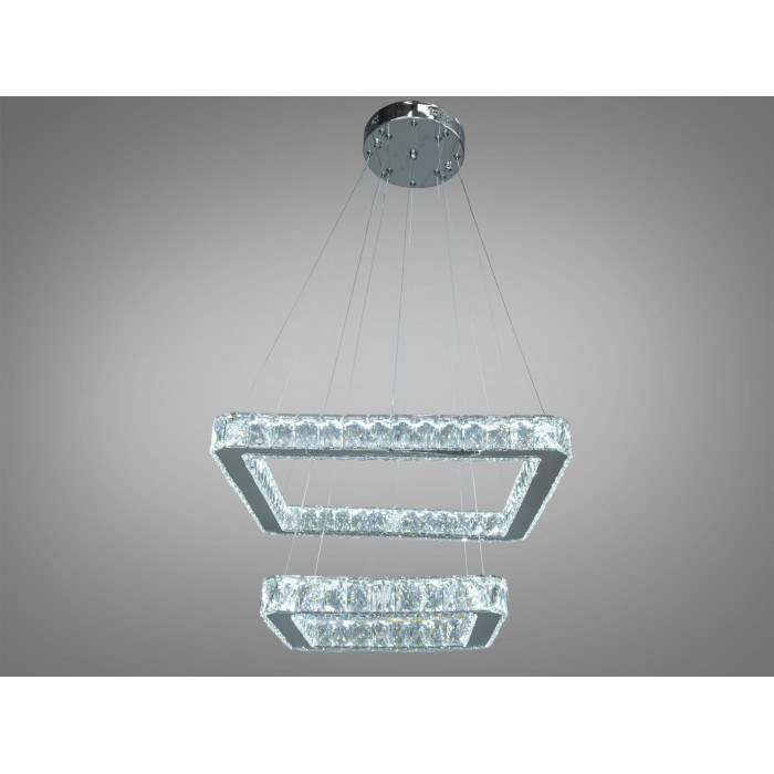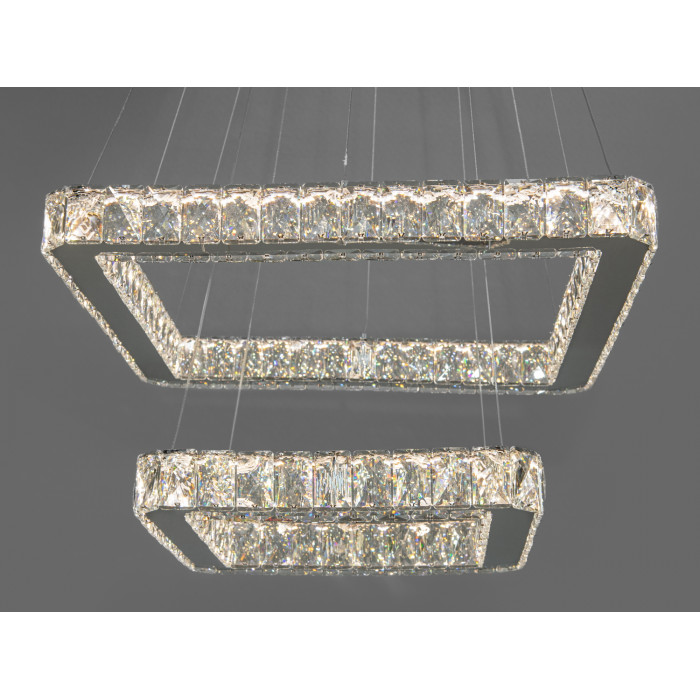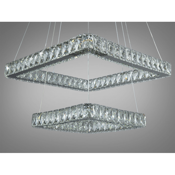 Уявіть собі вечір у вашій вітальні, коли повітря наповнюється теплим світлом, відблиски якого грають на стінах і стелі, створюючи атмосферу магії та затишку. Перед вами – справжній витвір мистецтва, підвісна кришталева LED люстра від ТМ "Діаша". Вона виглядає, як коштовність, що висить у повітрі, завдяки своїй витонченій конструкції з двох каскадних квадратних кілець.