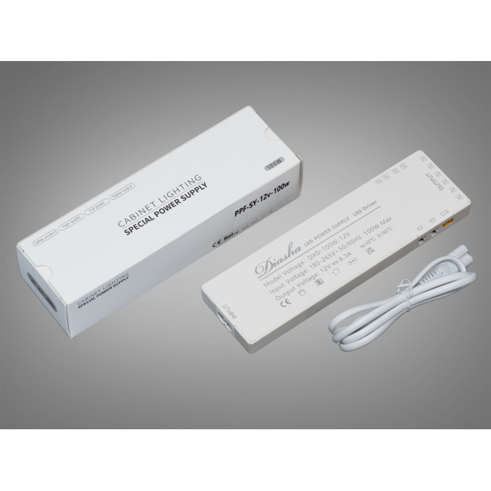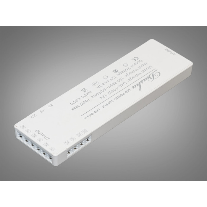 Цей керований блок живлення для лед стрічки підтримує стабільне живлення з вихідною напругою 12 В і струмом 8.3 А, що дозволяє використовувати його з потужними LED системами у кухонних гарнітурах, гардеробних, вітринах та робочих зонах.