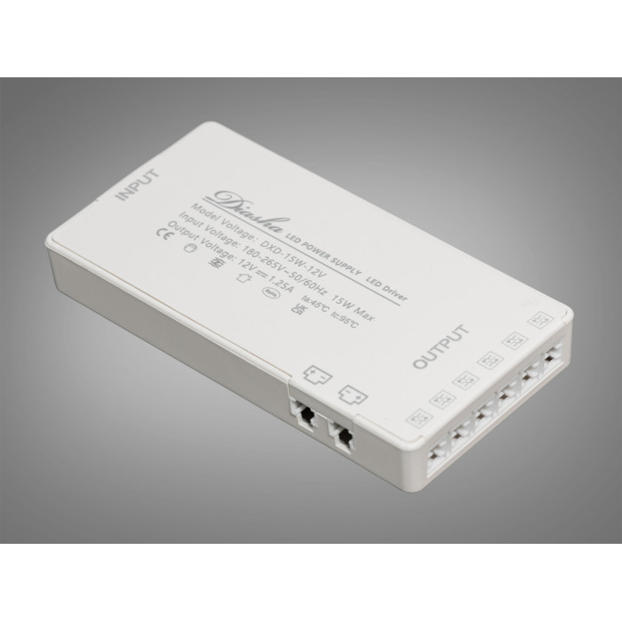 Пристрій підтримує вхідну напругу 180–265 В і видає стабільні 12 вольт для світлодіодної стрічки, з максимальною потужністю 15 Вт та струмом 1,2 А. Це ідеальне рішення для невеликих ділянок освітлення.