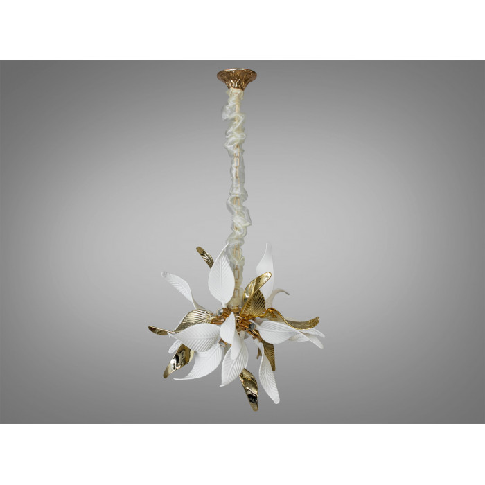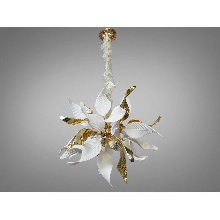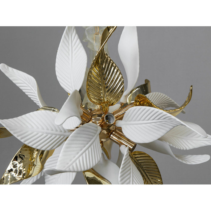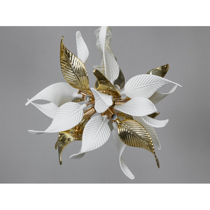 Використання високоякісної кераміки у вигляді пелюсток робить цю люстру вишуканою та універсальною для будь-якого інтер’єру. Білий фарфор надає легкості, а золоті акценти підкреслюють естетику.