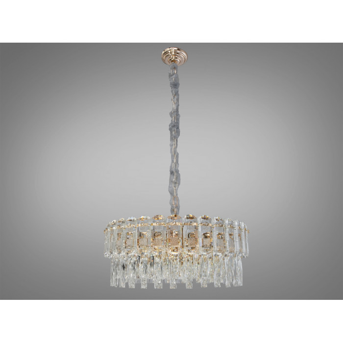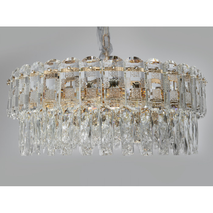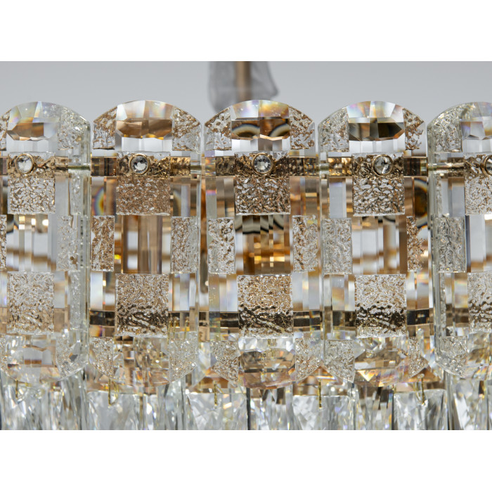 Під цим золотим поясом кришталів висять численні прозорі підвіски, кожна з яких являє собою маленьке диво майстерності. Вони створені для того, щоб ловити кожен промінь світла та перетворювати його на блискучий балет іскорок, які танцюють по кімнаті. Підвіски одного розміру створюють враження динамічної плинності, додаючи люстрі органічності та легкості.