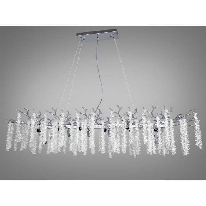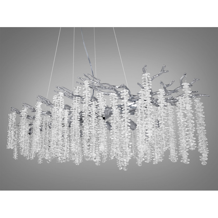 Ця унікальна люстра витягнутої форми виконана з хромованого металу, що надає їй сучасного вигляду і вражаючого блиску. Основна конструкція люстри нагадує розгалужене дерево, гілки якого покриті численними кришталевими підвісками. Кожна гілка виглядає як витвір мистецтва, майстерно виготовлений з високоякісного матеріалу, що підкреслює естетику та стиль люстри.