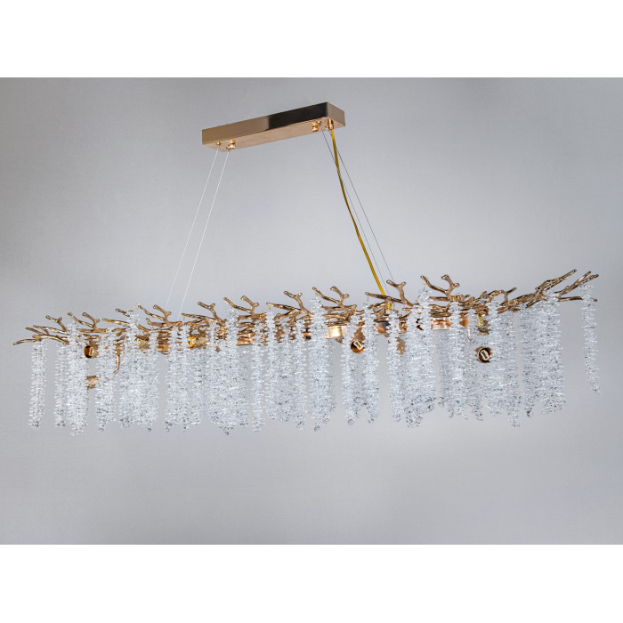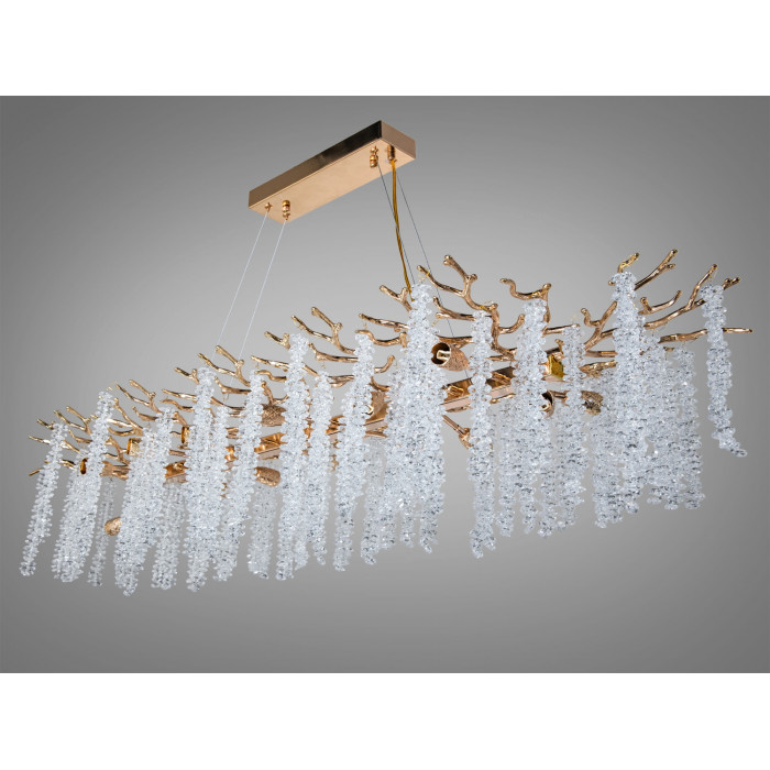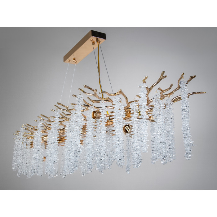 Ця унікальна люстра витягнутої форми виконана з хромованого металу, що надає їй сучасного вигляду і вражаючого блиску. Основна конструкція люстри нагадує розгалужене дерево, гілки якого покриті численними кришталевими підвісками. Кожна гілка виглядає як витвір мистецтва, майстерно виготовлений з високоякісного матеріалу, що підкреслює естетику та стиль люстри.