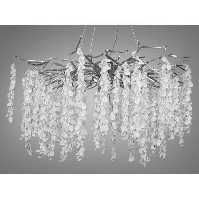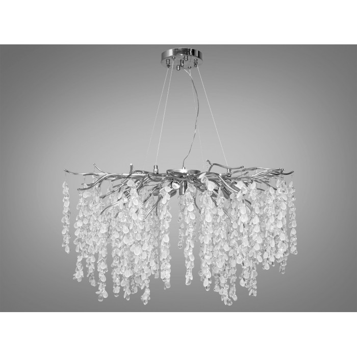 Основа люстри виготовлена з майстерно витих алюмінієвих гілок, кожна з яких увінчана вертикально розташованою гірляндою з матових та прозорих кришталиків. Ці кришталики грайливо відбивають світло, створюючи чарівну гру відблисків та тіней у приміщенні.
