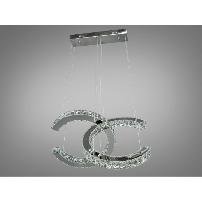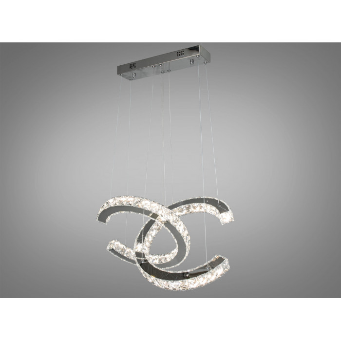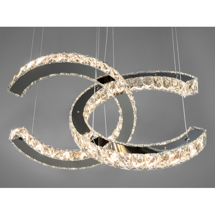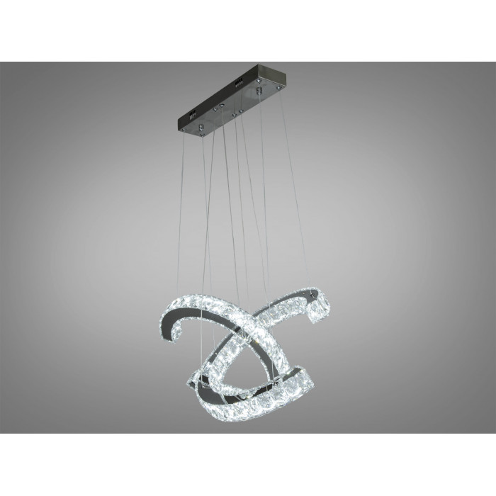 Перед вами унікальна підвісна кришталева світлодіодна люстра, яка є втіленням сучасного дизайну та розкоші. Ця люстра відразу привертає увагу своєю унікальною композицією, що складається з двох перехрещених дугоподібних елементів. Кожен з них ретельно інкрустований численними кристалами, які відбивають і розсіюють світло, створюючи чарівний ефект блиску.