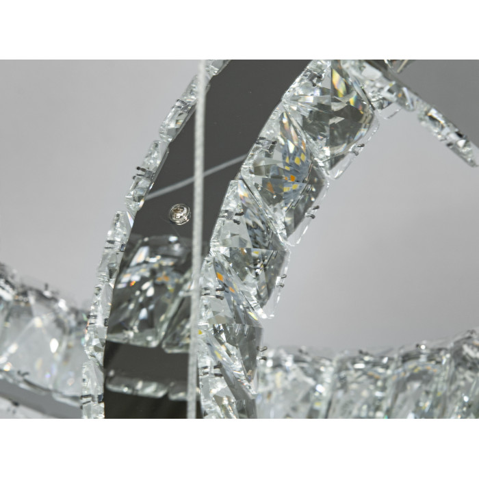 Люстра підвішена на тонких, майже невидимих тросах, що надає їй відчуття невагомості та легкості. Хромовані металеві частини підкреслюють її сучасний вигляд, додаючи нотки елегантності та вишуканості. Кристали, якими прикрашені дуги, мають складну огранку, яка дозволяє їм максимально ефективно відбивати світло, утворюючи тисячі маленьких іскорок, що наповнюють кімнату магічним сяйвом.