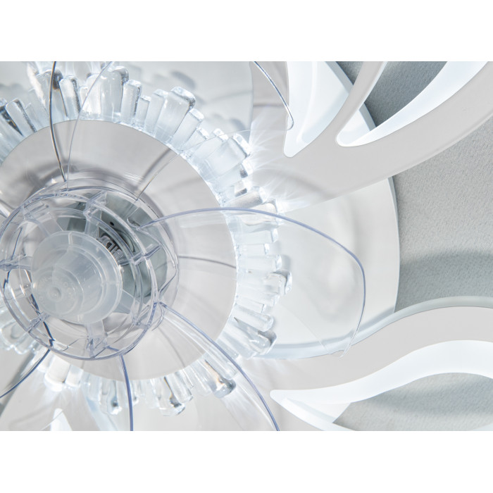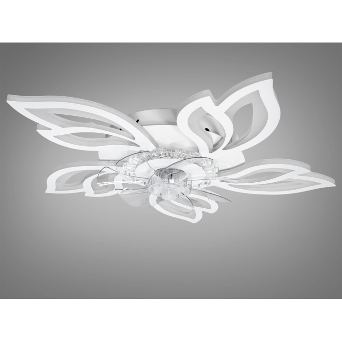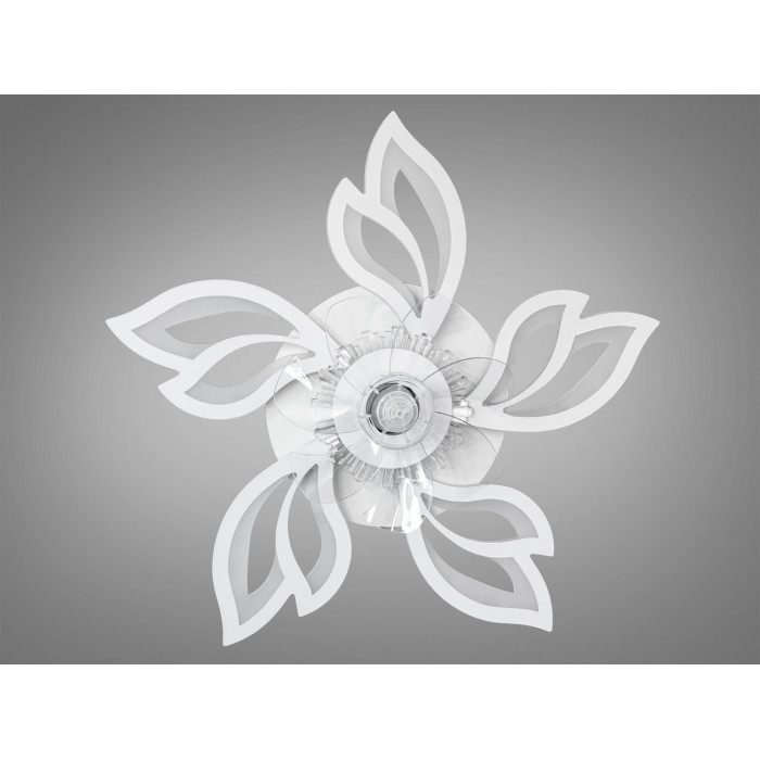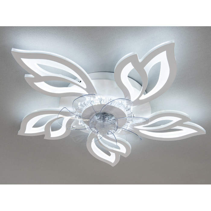 Ця стельова світлодіодна люстра вирізняється своїм витонченим білим кольором, що додає простору відчуття легкості та чистоти. Конструкція виконана з міцного металевого каркасу з плафонами з акрилу, що забезпечують рівномірне розсіювання світла. Витончені лінії пелюсток створюють ефект об'ємності, а прозорі лопаті вентилятора надають конструкції легкості.