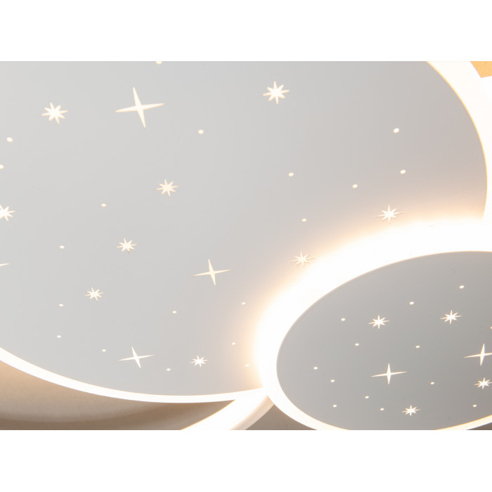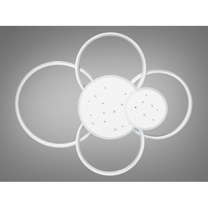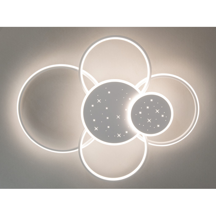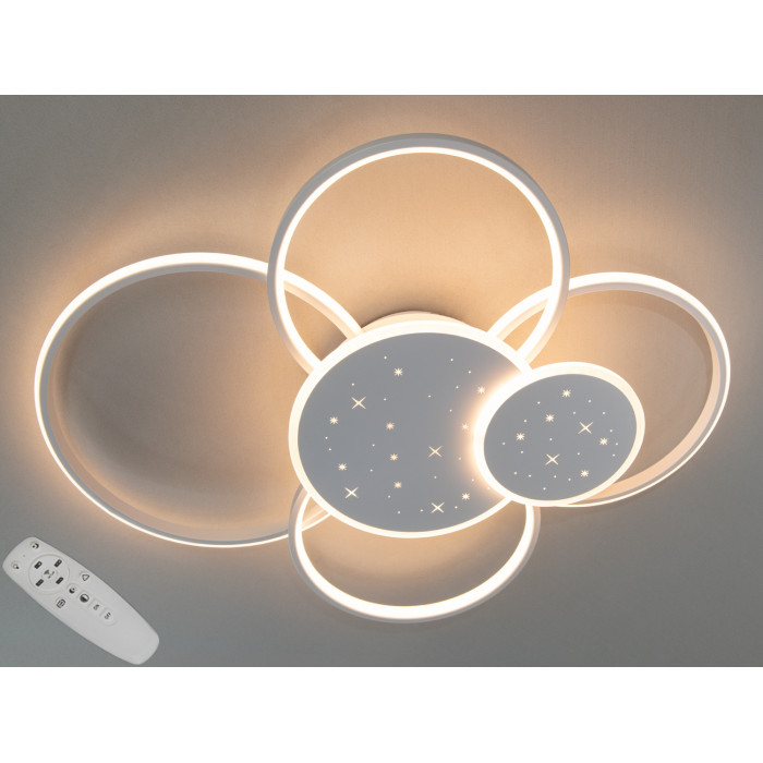 Стельова світлодіодна люстра з пультом, 115Вт, біла – це втілення сучасного стилю та передових технологій, що гармонійно поєднуються у витонченому дизайні. Її елегантні кільця, що перетинаються між собою, створюють унікальну композицію, яка вражає своєю гармонійністю та легкістю. Завдяки білому кольору корпусу, ця led люстра легко вписується у будь-який інтер’єр, надаючи йому додаткової естетики та вишуканості. М'яке світло, що рівномірно розсіюється по всій площі кімнати, створює комфортну та затишну атмосферу, а ефект зоряного неба додає візуального чару.