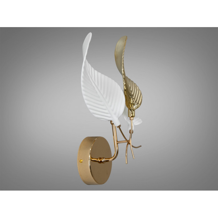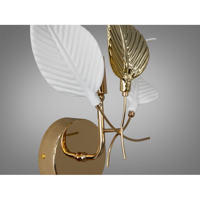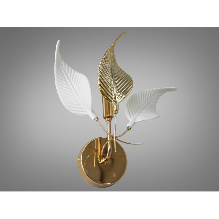 Це декоративне бра — справжнє втілення гармонії природи та витонченого дизайну. Воно одразу привертає увагу своїм унікальним виглядом, поєднуючи металеву основу з ніжними декоративними елементами із порцеляни. На круглому металевому корпусі, покритому сяючим золотим напиленням, тримаються три листоподібні порцелянові деталі. Один із листків виконаний із полірованого металу з текстурованою поверхнею, що створює яскравий контраст із матовою порцеляною двох інших.