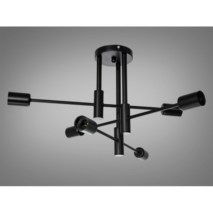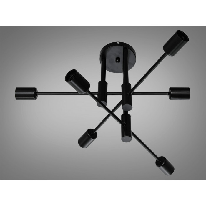 Елегантність і практичність поєднуються у цій виразній, універсальній люстрі у стилі Loft від ТМ «Діаша», яка заслужено займе центральне місце у сучасному інтер'єрі. Вона має шість патронів Е27, розташованих на геометрично розміщених чорних металевих прутках, що дозволяє люстрі гармонійно поєднуватися з будь-якими дизайнерськими рішеннями. Люстра під натяжну стелю, завдяки своєму універсальному чорному кольору, ідеально вписується в мінімалістичні простори.