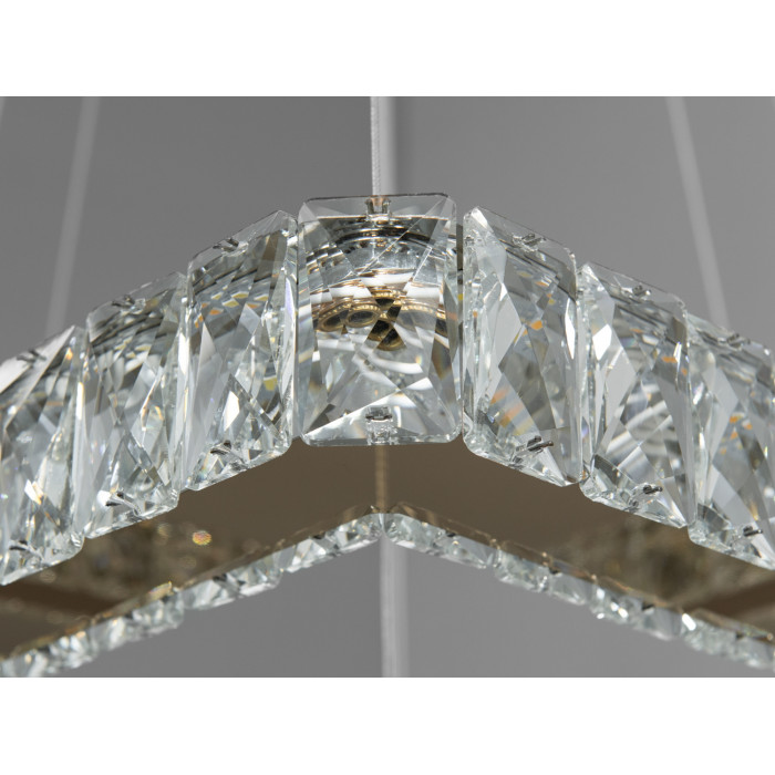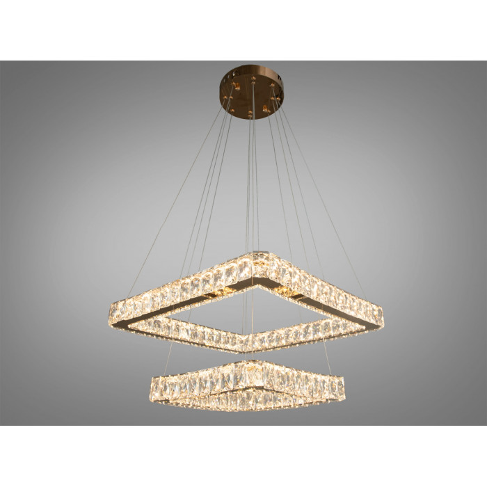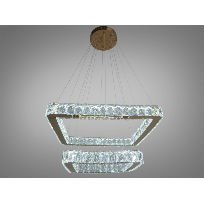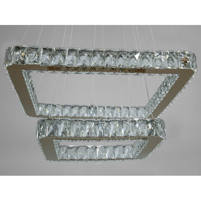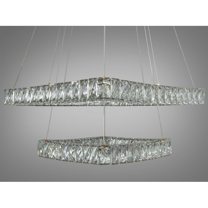 Перед вами витвір сучасного мистецтва – кришталева підвісна LED люстра від ТМ "Діаша". Вона вражає своєю елегантністю та витонченістю, поєднуючи в собі сучасний дизайн і високоякісні матеріали. Два каскадні квадратні кільця, прикрашені блискучими кришталями, підвішені на тонких, майже невидимих тросах, створюють ілюзію невагомості. Кожне кільце, наче дорогоцінний обруч, осяяний магічним сяйвом, надає простору вишуканого вигляду.