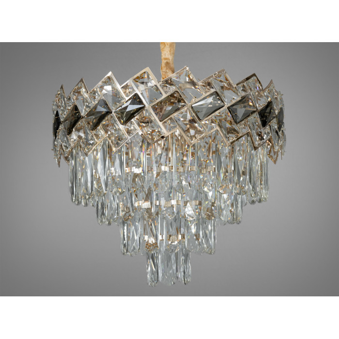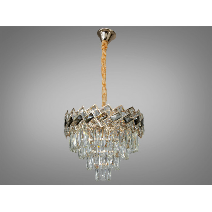 Верхня частина люстри прикрашена кришталевими ромбами, які утворюють корону, надаючи виробу об'ємності та динамічності. З-під корони спускаються численні довгі кришталеві підвіски, які утворюють три рівні, додаючи люстрі складності та багатошаровості. Ці підвіски блищать і переливаються на світлі, створюючи атмосферу розкоші та вишуканості в кімнаті.