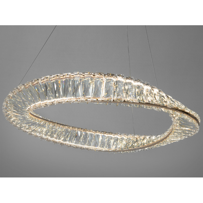 Лед люстра виготовлена у формі стрічки Мебіуса з кришталів, що створює ефект безперервності та плинності, який майже гіпнотизує і зачаровує. Кожен вигин, кожен кут світла, що відбивається від численних граней кришталів, розсіює яскравість і створює блискучу гру світла по всій кімнаті.