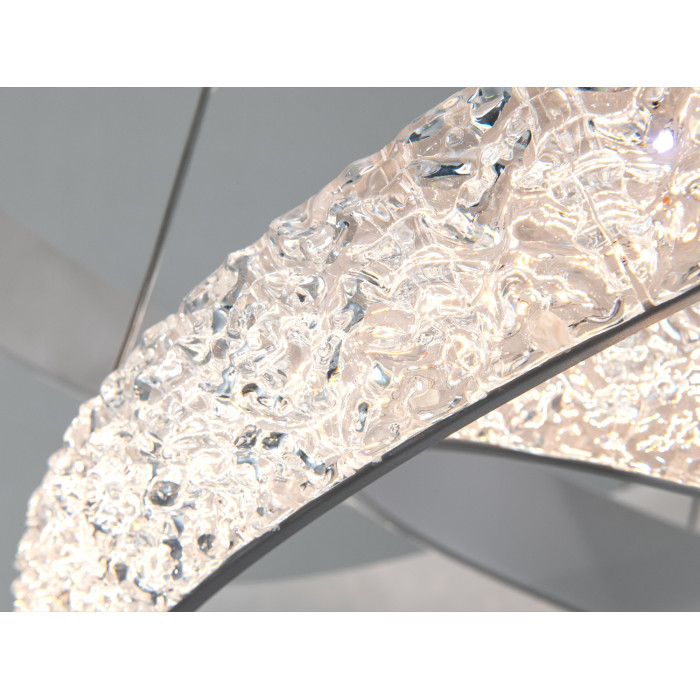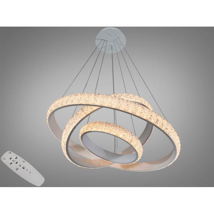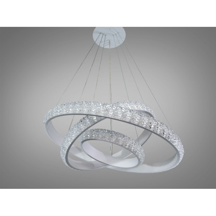 Сучасна світлодіодна люстра на підвісах, є справжнім втіленням сучасності та витонченості в дизайні освітлювальних приладів. Три незалежні кільця різних розмірів виконані в золотому кольорі, мають елегантний металевий блиск та наявність розсіювачів зі стильного рифленного акрилу схожого на кришталь, що додає люстрі легкості та повітряності. Кожне кільце здається плаваючим у повітрі, створюючи ілюзію невагомості.