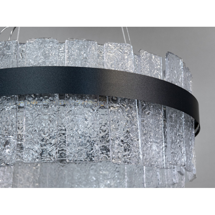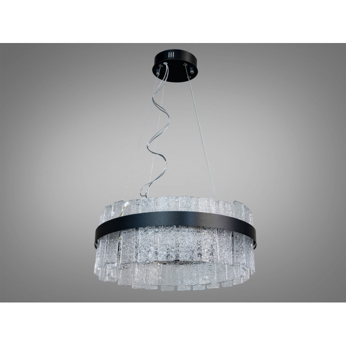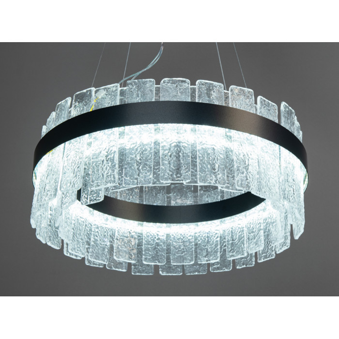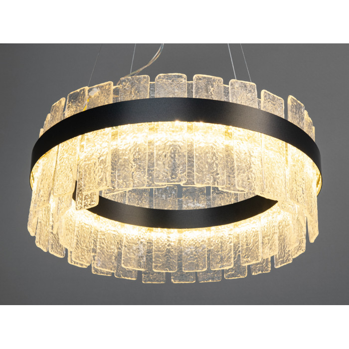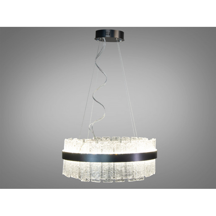 Круглий силует лед люстри 2024, підтриманий бронзовим металевим обідом, створює ілюзію світлового вінка, що увінчує простір, додаючи йому ауру респектабельності та візуального простору. Криштали, наче зимова роса, що тільки-но застигла на ранкових гілках, відбивають світло, розсіюючи його в усі боки й створюючи незліченні іскристі відблиски. Великою перевагою цієї люстри є регулювання колірної температури (3200K, 4100K, 6000K).