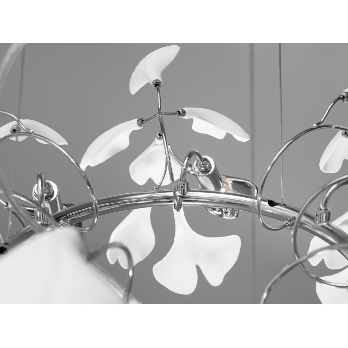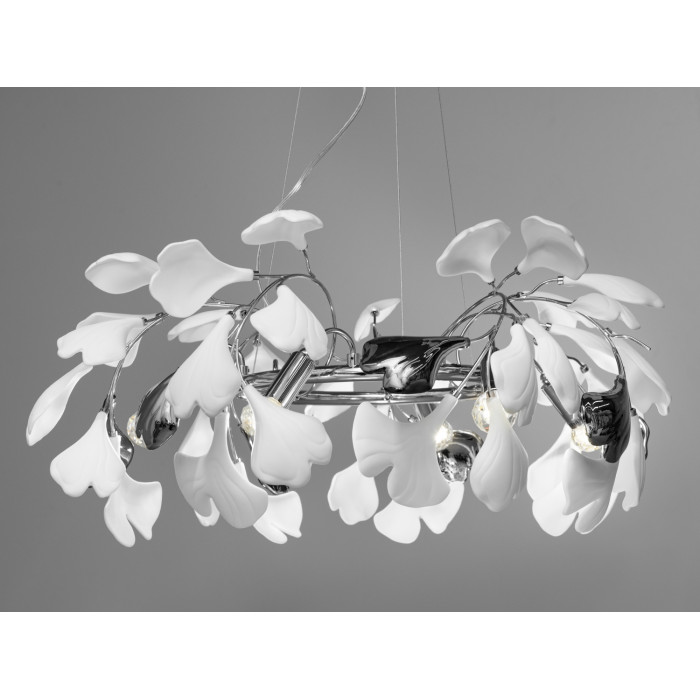 Люстра в стилі арт деко з фарфоровими елементами, яка виринає перед нами з глибини образотворчого мистецтва, немов цвіт, що розкриває свої пелюстки під сонячними променями золотого ранку. Кожен фарфоровий елемент, що має форму листя Гінкго Білоба, є втіленням вишуканості та легкості, ніби невагомий танець білосніжних метеликів, що майорять у повітрі. Це не просто освітлювальний прилад, але й символ безвікової мудрості та витонченості, який з часів античності був оберегом довголіття та благополуччя.