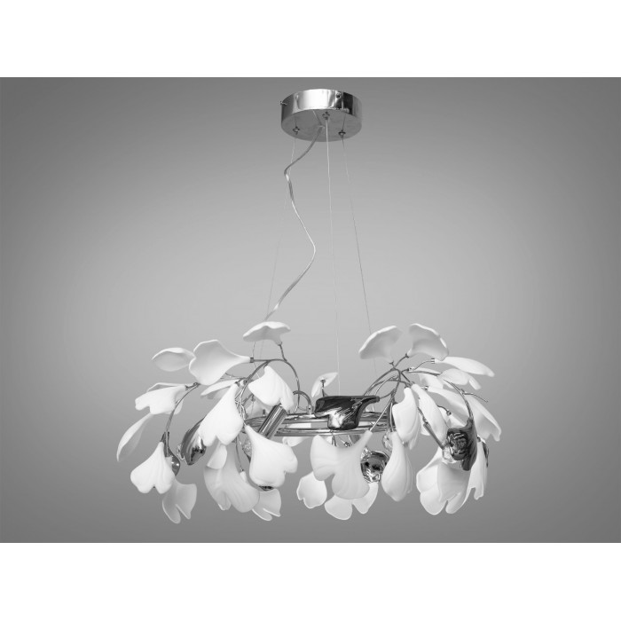 Контрастні хромовані відтінки пелюсток додають сучасної розкоші, підсилюючи відчуття тепла і світла, яке розливається від ламп цоколь E14. Регульована висота люстри дарує свободу вибору, як диригенту, який налаштовує оркестр під власну мелодію – у цьому випадку, налаштовує освітлення простору під власні потреби та бажання.