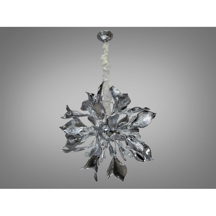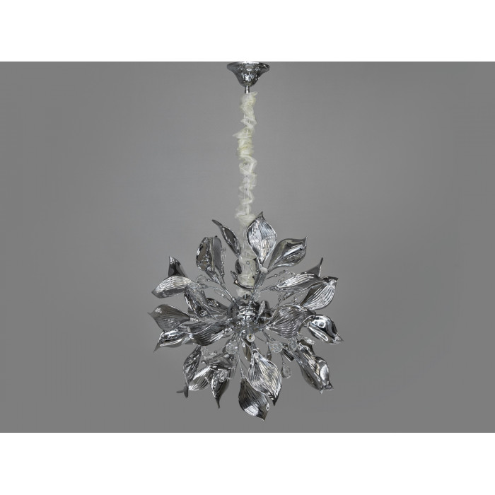 Вражаюча підвісна люстра кольору хрому — це не лише джерело світла, а й витвір сучасного мистецтва, який здатен змінити атмосферу вашого інтер’єру. Її конструкція нагадує розквітлу квітку, пелюстки якої виконані з блискучих керамічних елементів у холодному металічному відтінку. Дев'ять ламп під патрон E14 рівномірно розподілені по композиції, забезпечуючи м’яке, але потужне освітлення. Стильний підвіс з декорованим текстилем, додає витонченості та елегантності цьому дизайнерському шедевру.