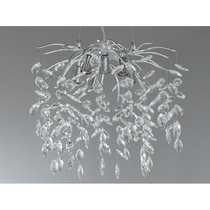Люстри сучасні, як ця, стають не просто джерелом освітлення, а справжньою прикрасою приміщення. Плавні лінії хромованої конструкції на тросах забезпечують елегантність цьому висококласному освітлювальному приладу, а прозорі кришталі відтворюють неповторний візерунок на стінах і стелі, коли світло проходить крізь них.