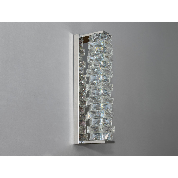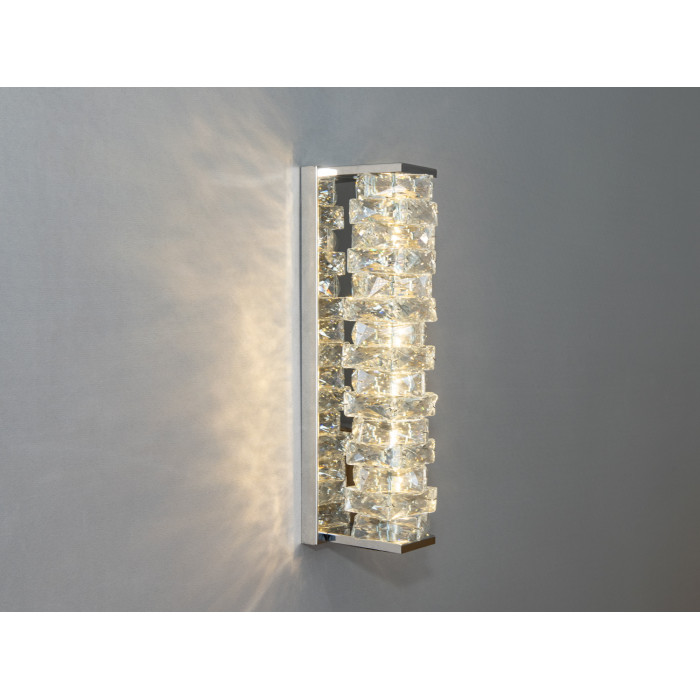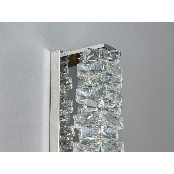 Цей настінний світильник бра є прикладом витонченого поєднання сучасних технологій, елегантного дизайну та преміальних матеріалів. Його вишукана конструкція виконана з хромованого металу, який додає інтер’єру блиску та стриманого шику. В основі кришталевого світильника — вишуканий кришталевий декор, що складається з прозорих граней, розташованих шарами, які створюють унікальний ефект світлової гри. Світло, проходячи крізь кристали, розсіюється, утворюючи безліч сяючих відблисків на стінах і стелі, додаючи приміщенню тепла та вишуканості.
