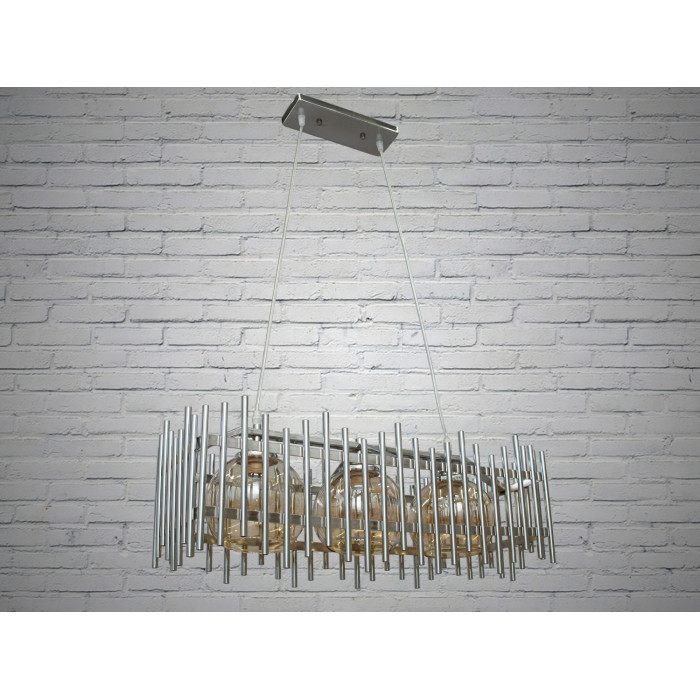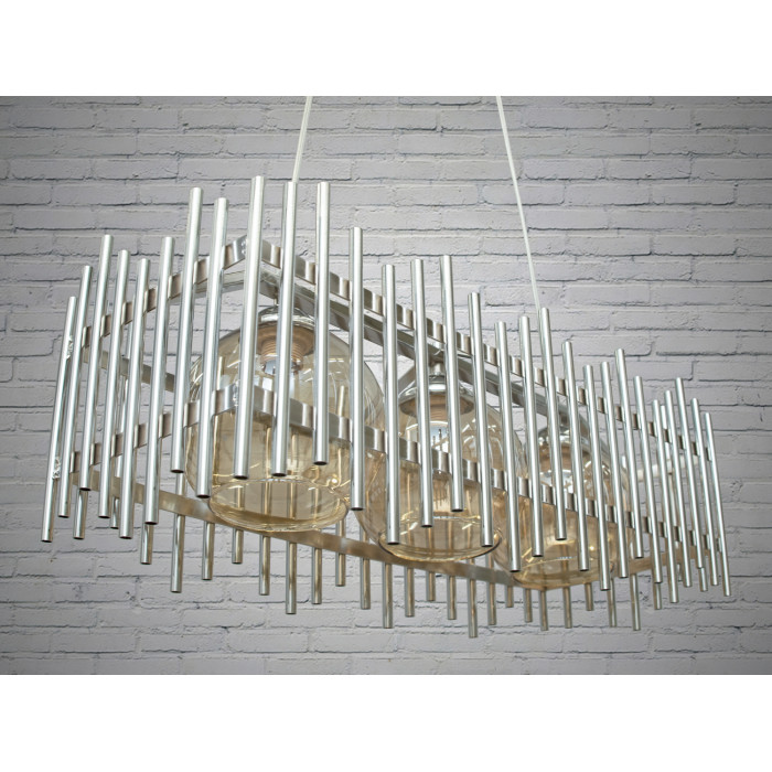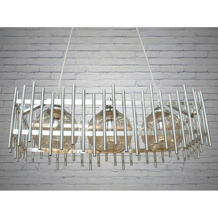 Світильник має прямокутну форму з хромованого металу, що додає йому індустріального вигляду. Каркас світильника складається з тонких металевих трубок, які формують ґратчасту конструкцію навколо трьох скляних плафонів. Такий дизайн створює ефект легкої прозорості та дозволяє світлу вільно розповсюджуватися по приміщенню, створюючи м'яке, розсіяне освітлення.