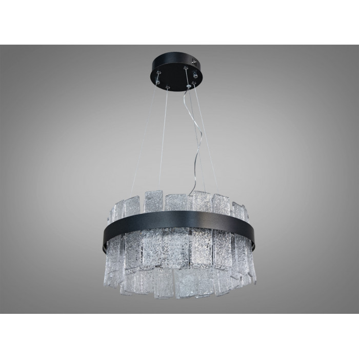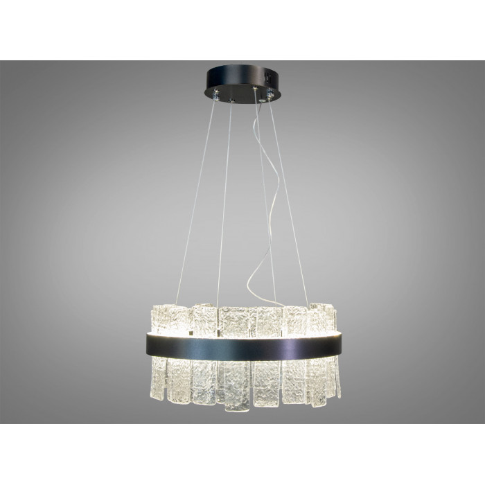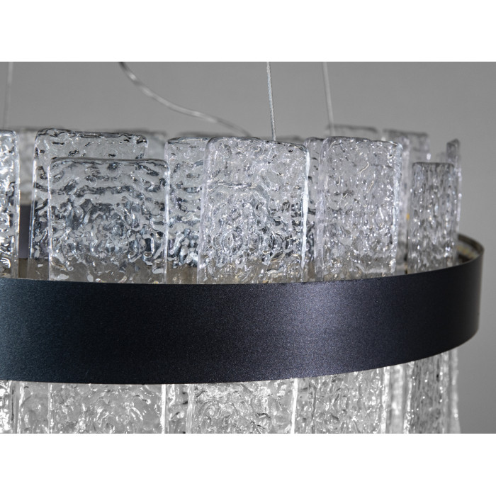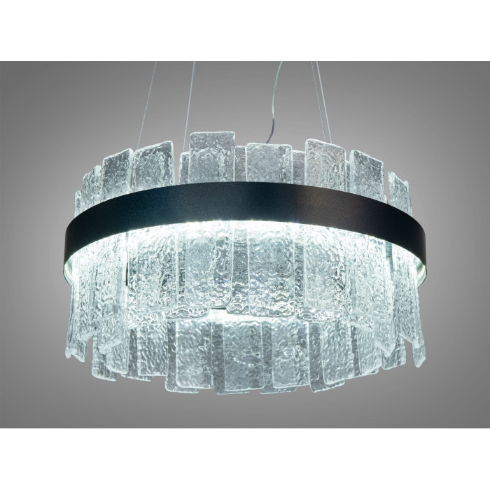 Конструкція лед люстри 2024 складається з міцної металевої основи, яка має гарний матовий відтінок золота, що додає виробу шарму та розкоші. Вона утримує множину прямокутних кришталевих підвісок, які мають неправильну текстуру, нагадуючи замерзлу воду або природні мінерали. Ці кришталі розміщені у два ряди і створюють відчуття пишноти та глибини. Світло, проходячи крізь ці підвіски, створює чарівне світлове шоу, відбиваючись та розсіюючись у різних напрямках, що додає інтер′єру вишуканої динаміки.
