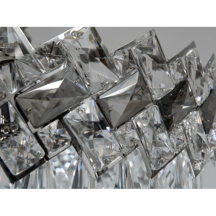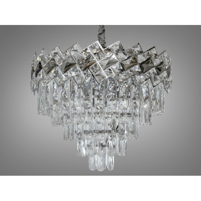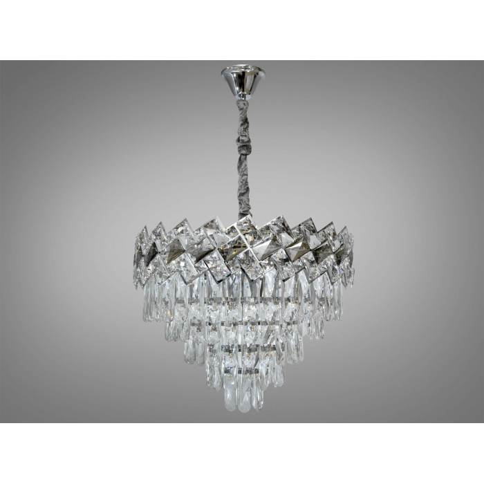 Кожна деталь цієї підвісної люстри випромінює розкіш, від блискучої металевої основи хромованого кольору до кришталів, які генерують чудове мерехтіння при кожному погляді. Люстри кришталь вносять атмосферу багатства та вишуканості, що робить їх ідеальними для зали, де приймають гостей чи проводяться урочисті вечори.