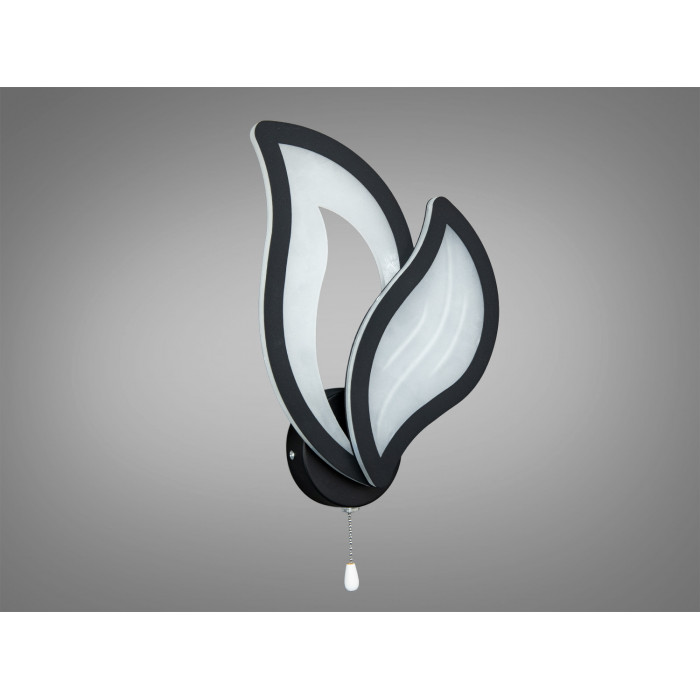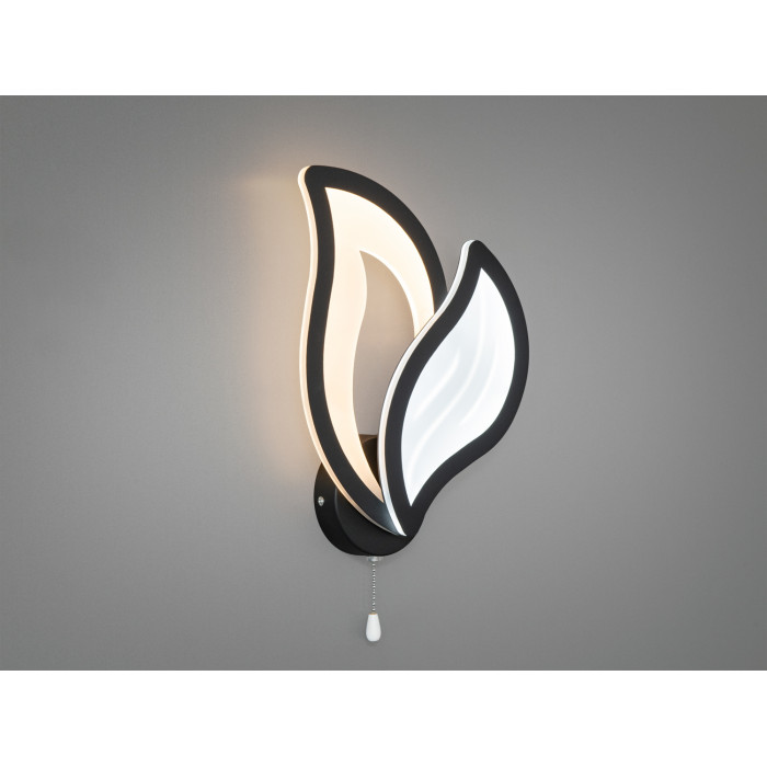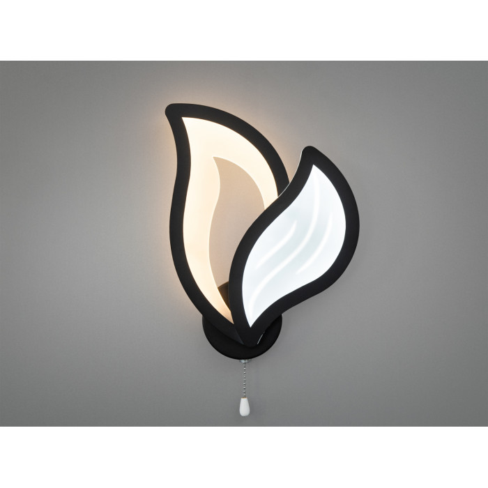 На зображенні представлено витончений та елегантний золотий світлодіодний світильник для спальні, що вражає своїм естетичним виглядом, вишуканим силуетом та вдалим поєднанням кольорів. Його форма нагадує пару пелюсток або листків, які ніби застигли в динаміці легкого руху. Основна частина світильника виконана з акрилу з золотим декоративним обрамленням, яке надає виробу шляхетності та тепла. Контури пелюсток підсвічуються LED-світлом, що рівномірно розподіляється всередині акрилових елементів, створюючи м’яке та приємне для очей сяйво. Основу світильника складає кругла металева платформа з глянцевим золотим покриттям, яка гармонійно поєднується з формою декоративної частини. У нижній частині бра розташовано зручний ланцюжковий вимикач із каплевидним білим наконечником, що забезпечує комфортне керування світлом без потреби в настінному вимикачі. Усе це робить цей настінний LED світильник не лише джерелом світла, а справжнім декоративним акцентом, який прикрасить будь-який сучасний інтер’єр.